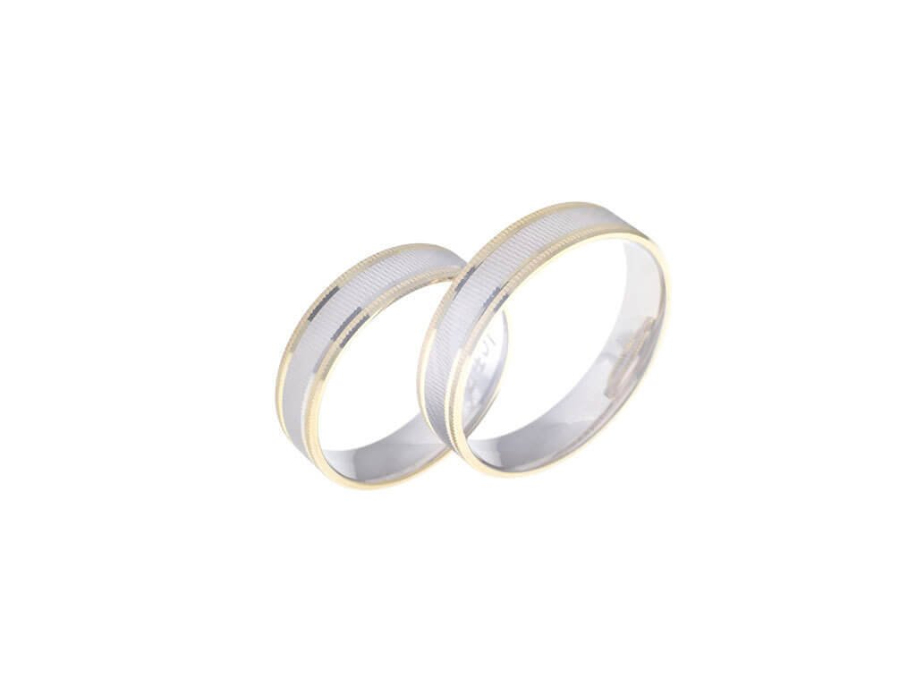 Snubní prsteny v kombinaci bílého a žlutého nebo bílého a červeného zlata, případně i celé bílé, žluté nebo červené s gravírovaným povrchem, bez kamenů.