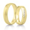 Snubní prsteny v bílém, žlutém, červeném nebo kombinovaném zlatě v lesku a diamantovém matu s drážkou, která je v dámském základním modelu ozdobena 5 zirkony nebo brilianty.