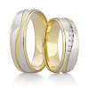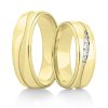 Snubní prsteny se sníženými boky v kombinaci bílého zlata nahoře a červeného (růžového) nebo žlutého zlata uvnitř prstenů nebo jednobarevné s lesklým středem zdobeným matnou vlnovkou. Dámský model je doplněn 7 kameny, které spolu vyplňují rozšiřující se místo ve vlnovce.